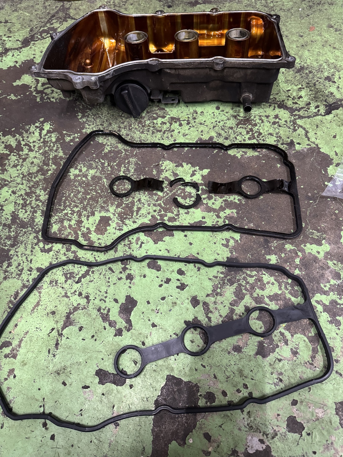 タペットカバーのゴムパッキンが経年劣化で硬化して、オイル漏れが発生しました😬